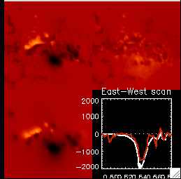 The task NLFFF_MAGN extracts the corresponding subimage from the HMI magnetogram and decovolves the line-of-sight magnetogram into the specified NMAG_P=200 potential field magnetic sources. A control display (if TEST=1 is set) is shown with the original magnetogram (top left), the decomposed model of the magnetogram (bottom left), the difference between the observed and the model diagram (top right panel), as well as an East-West scan through both the original (red curve) and model magnetogram (white curve) (bottom right panel).