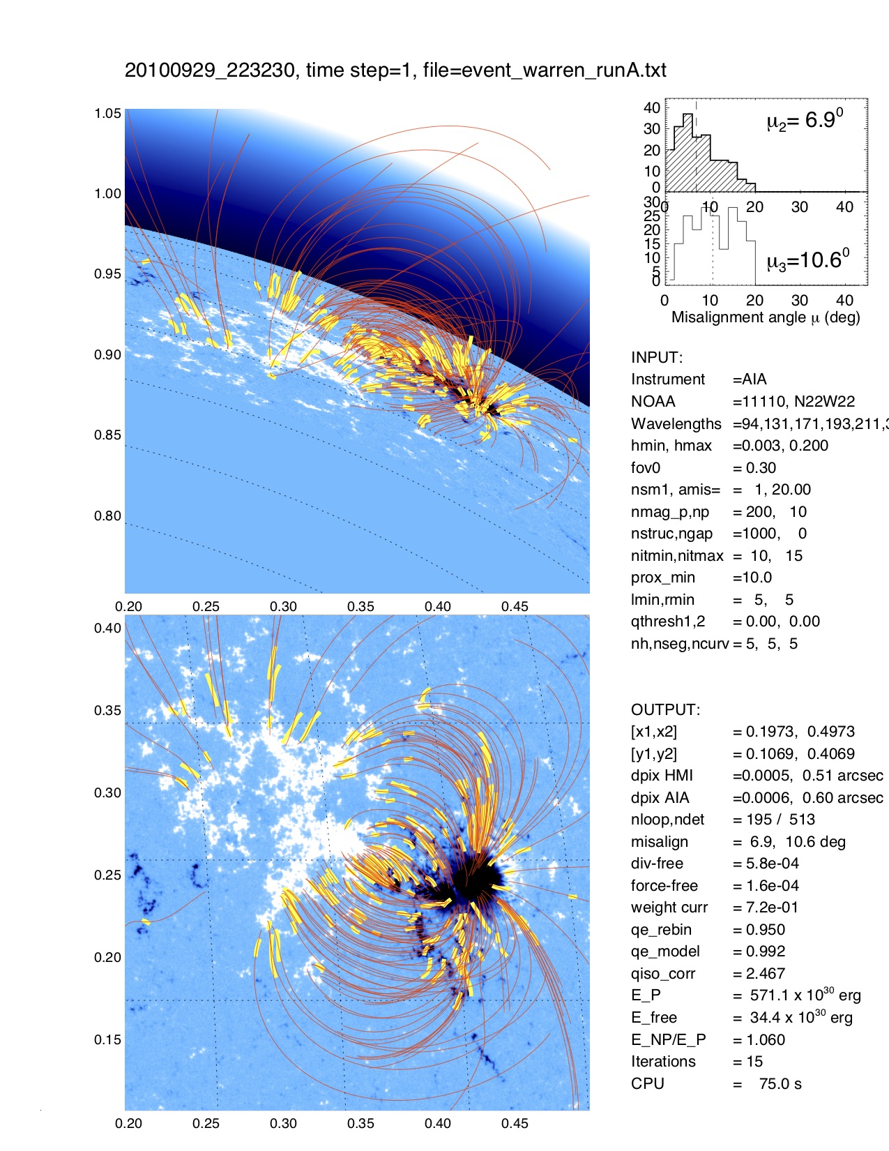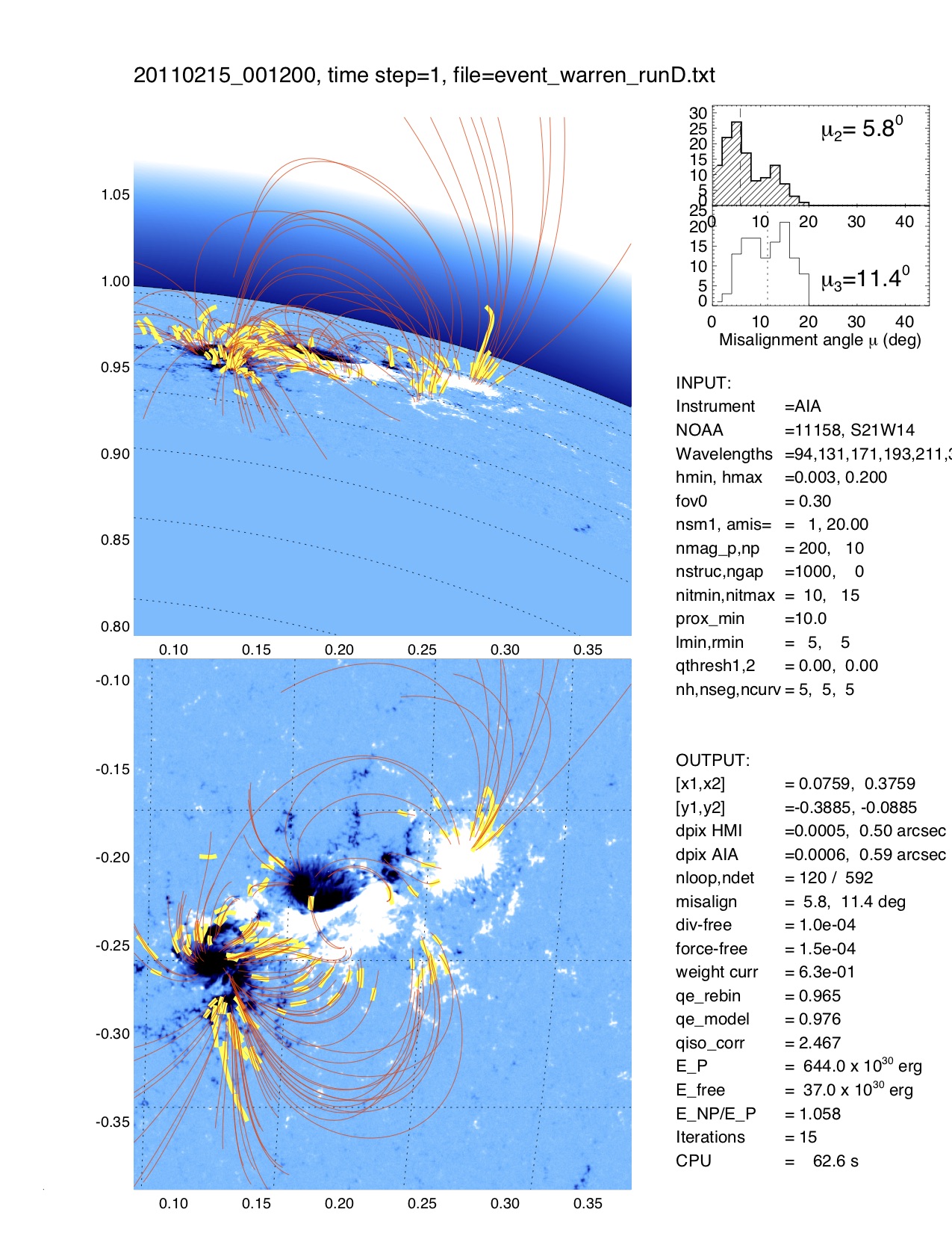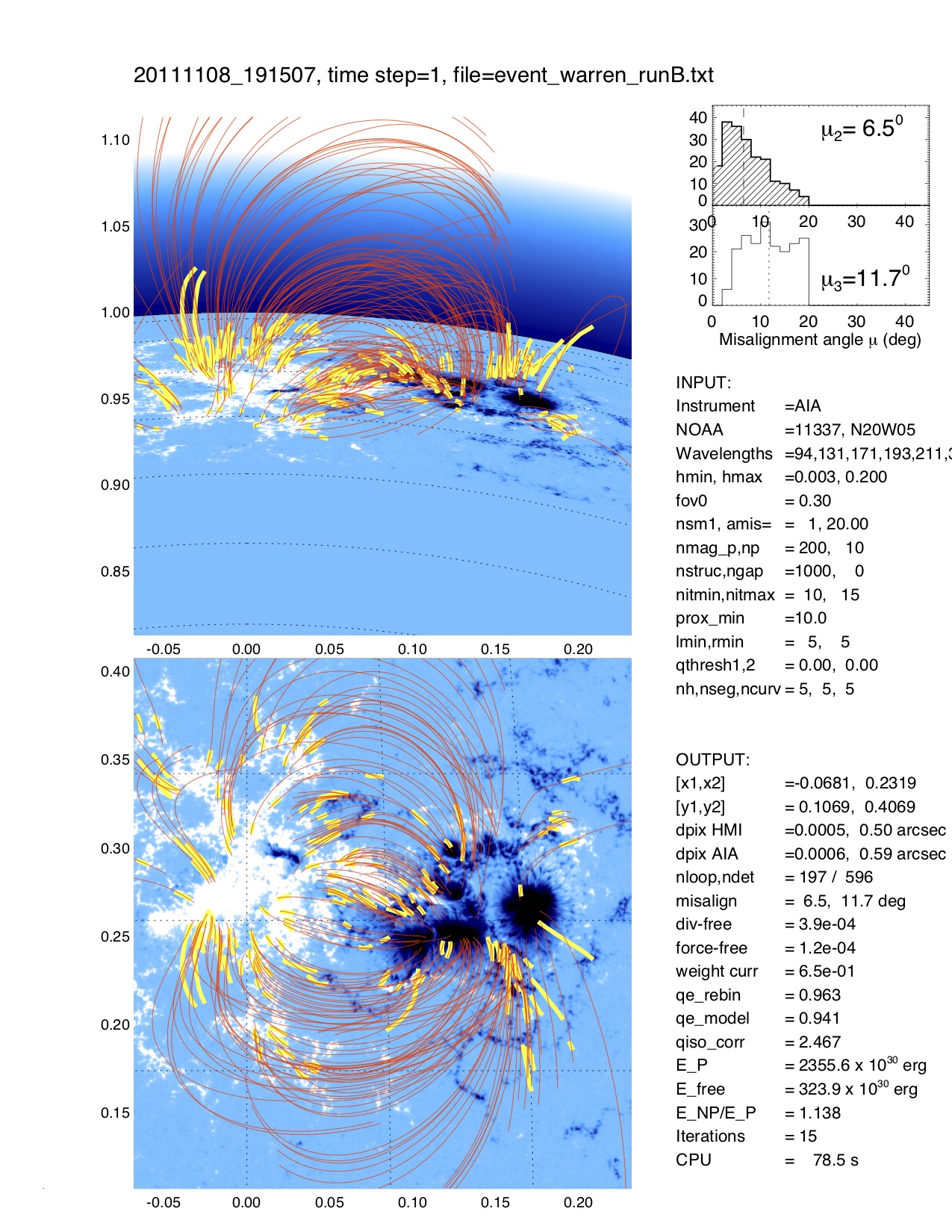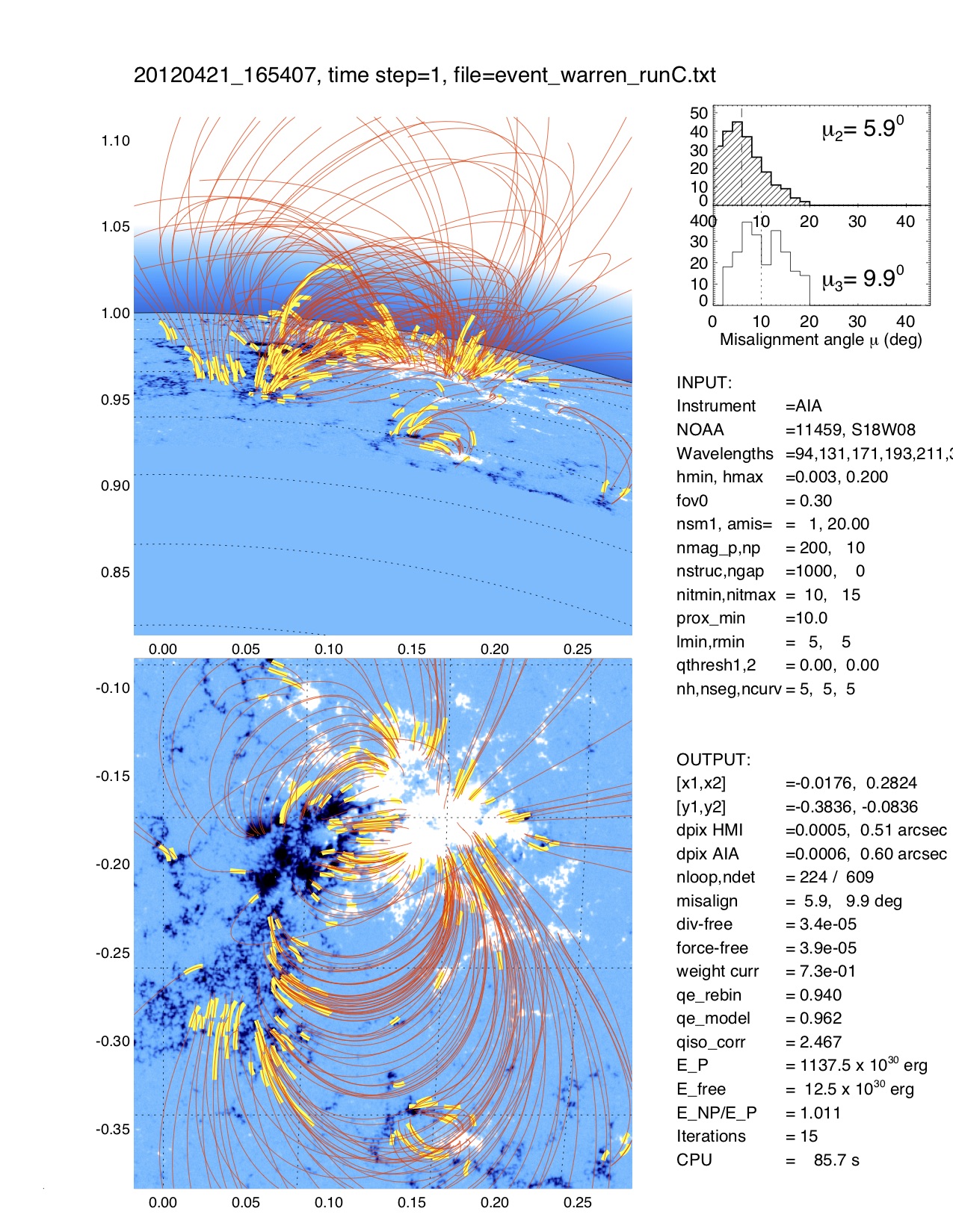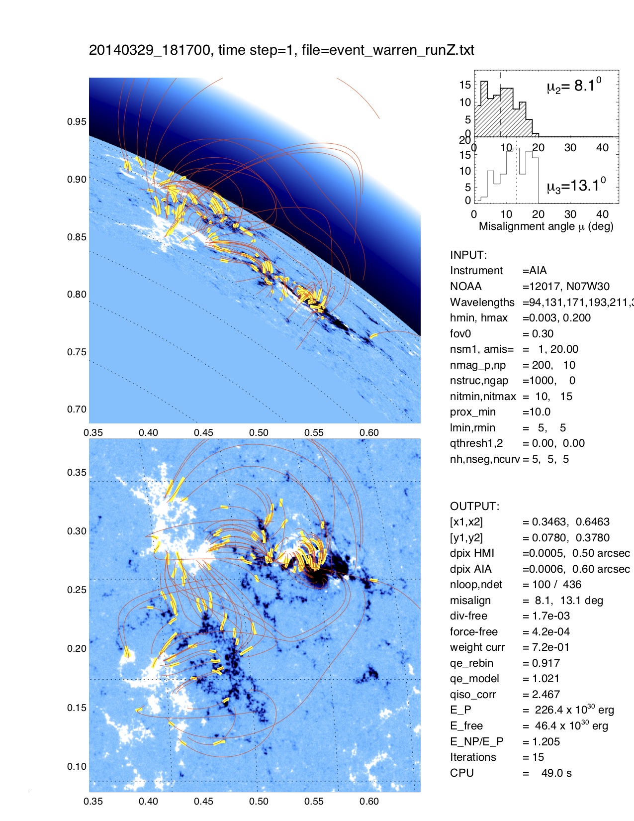The task NLFFF_TRACING traces then in each of the 8 AIA wavelength images curvi-linear features and displays the tracings superimposed on one of the AIA images (if TEST=1 is set). The task NLFFF_FIT is then the main computation task that fits a nonlinear force-free solution to the geometry of the traced loops, by minimizing the median 3D misalignment angle. Typical computation times are about 1 minute. The task NLFFF_FIELD computes then a specific data set of modeled field lines that intersect the midpoints of the automatically traced loop segments. The procedure NLFFF_CUBE can be used to calculate an entire 3D cube of B-field vectors, if CUBE=1 is set, otherwise a minimum cube with only nz=3 bottom layers is calculated. The routine NLFFF_MERIT calculates also some figures of merit, and the task NLFFF_ENERGY integrates the non-potential and free energy over the entire computation volume. In a final step, a quick display of the results can be produced with the procedure NLFFF_DISP, which shows the obtained 3D loop trajectories and field lines from two different aspect angles (line-of-sight and 90 deg rotated to North. A postscript file is automatically produced from this display, with the filename "20140329_181700_AIA_001_runA_col.ps":
